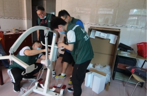 这天,伙伴们自发形成了两个分队,第一小分队的伙伴们搬运安装移位机,并且亲身试用,检验移位机安全性,以便能在床、轮椅等区域之间移动,保障小朋友在人为移动中造成的二次损伤。